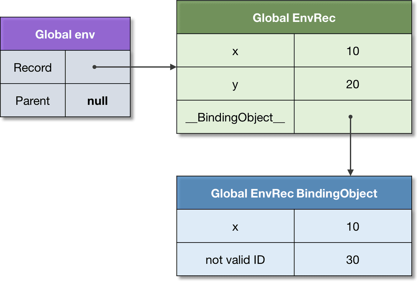 Since there is a link between the environment from child to parent, the identifier resolution work similarly to prototype delegation. Which means, when an identifier is not found in the execution environment, it is searched in its parent, and then its parent until found or reach the end(global).