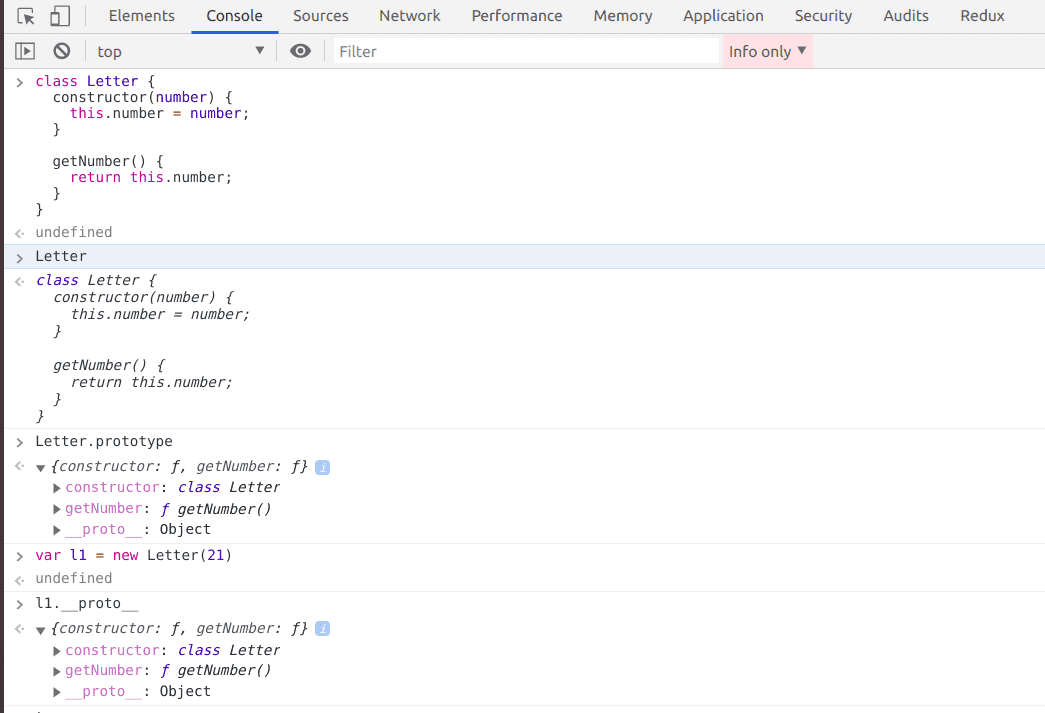 If you just print the prototype links, you can find that the getNumber function is added to the prototype of Letter and that prototype is assigned to the __proto__ of all the newly created object with the class