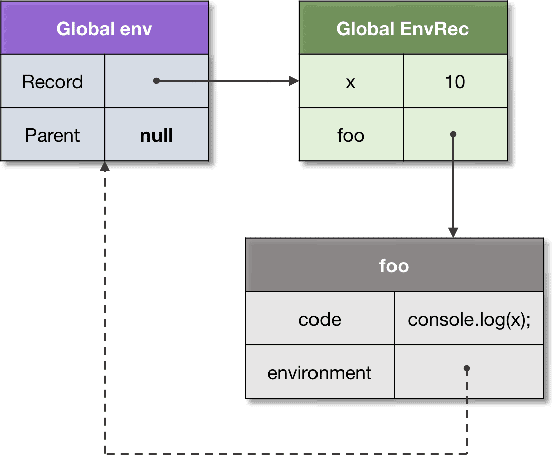 bar(); // 10, not 20!The above code is an example of upward funarg problem. Here the capturing enviroment outlives the context which creates it. Again, technically it doesn’t differ from the same exact mechanism of capturing the definition environment. Just in this case, hadn’t we have the closure, the activation environment of foo would be destroyed. But we captured it, so it cannot be deallocated, and is preserved — to support static scope semantics.